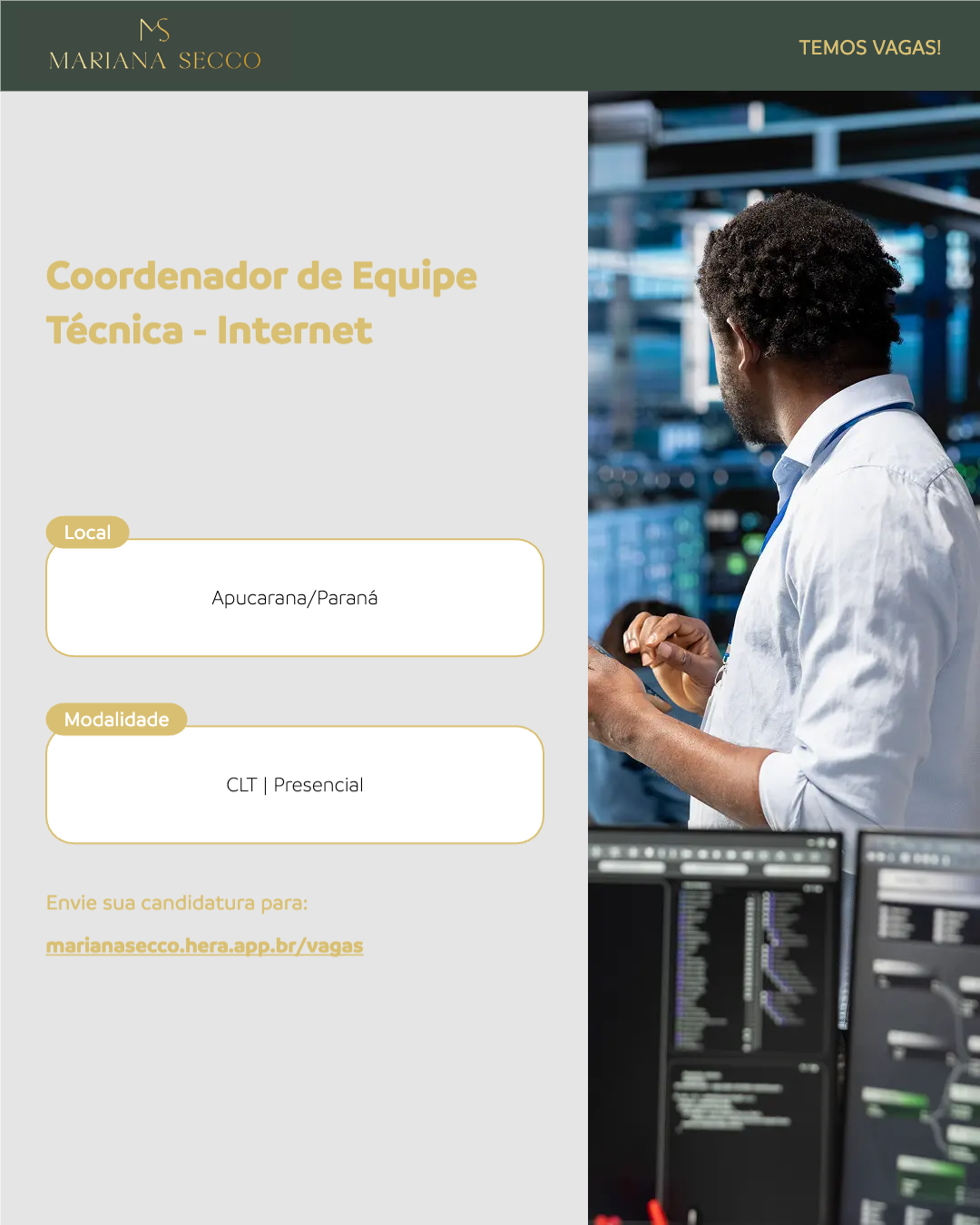 Responsável por coordenar e acompanhar as equipes técnicas de campo, suporte e infraestrutura, garantindo a qualidade dos serviços prestados, o cumprimento de prazos e o alcance dos indicadores e metas da área. Atua de forma preventiva e corretiva na gestão de falhas, assegurando a organização dos processos técnicos e a melhoria contínua das operações.